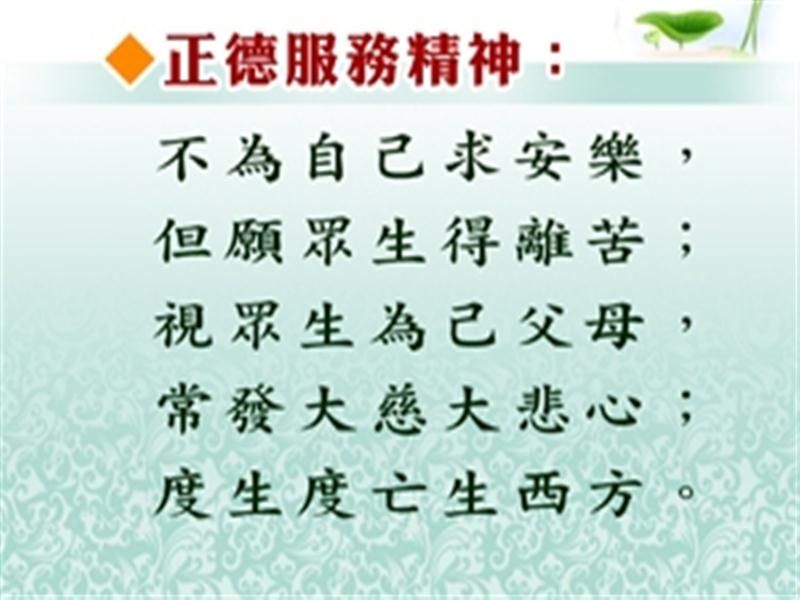 以「慈善、文化、教育」為三大目標,即以慈善來福利眾生;以文化來弘揚弘法;以教育來廣渡眾生。提供全方位的服務,來幫助眾生解決人生必然面臨的各種問題。同時,為落實真正的慈善精神,正德所提供各項服務皆以免費方式與眾生結緣,適時幫助許多需要的人,基於這份慈悲善念陸續感召許多人投入,形成一股社會清流。