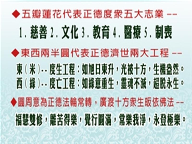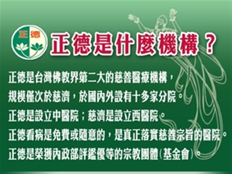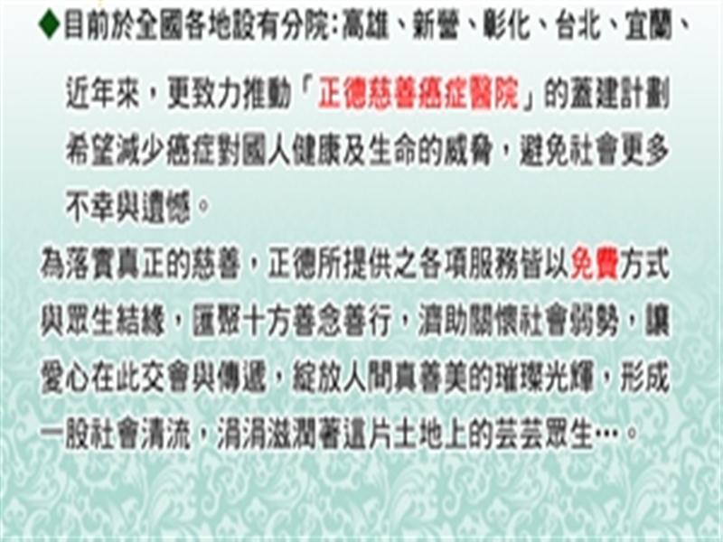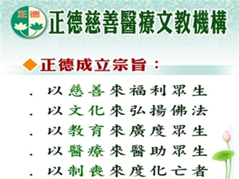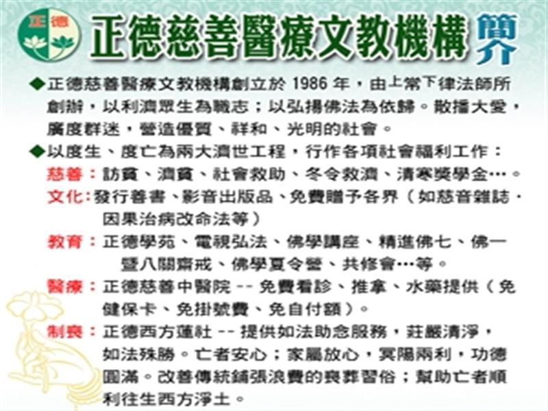 正德慈善文教機構從創辦始至去年止,近二十年來,國內外擁有五家慈善連鎖中醫院、十三家基佛堂及西方蓮社、十三家文教學苑及圖書館、正德埔里大佛的佛教文化院、正德孤兒院、慈音雜誌社、正德慈善社會福利基金會,國內外共十個機構,目前正籌建正德僧伽癌症慈善中西醫院。