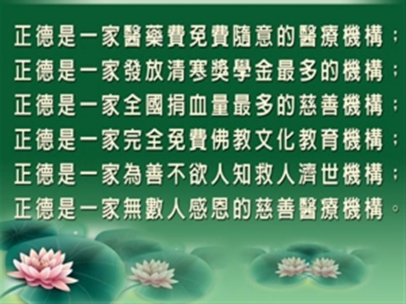 多年以來,正德人行善足跡早已遍佈每一個角落,普獲各界一致的肯定與讚嘆!相信這朵行善的花朵,在常律法師的帶領之下,將綻放得愈加璀璨亮麗,早日實現人間淨土的理想境界。正德機構出家師父與員工的血淚史正德機構是創辦師父「常律法師」以犧牲生命的精神建立起來的正德慈善文教機構從創辦始至去年止,十五年來,國內外擁有五家慈善連鎖中醫院、十三家佛堂及西方蓮社、十三家文教學苑及圖書館、正德埔里大佛的佛教文化院、正德孤兒院、慈音雜誌社、正德慈善社會福利基金會,國內外共有十個機構。師父出家不久,不是今天要開會,就是明天要主持法會,後天慈善活動,又要至各地講法,接見信眾,每週平均從南到北得跑全台一周。