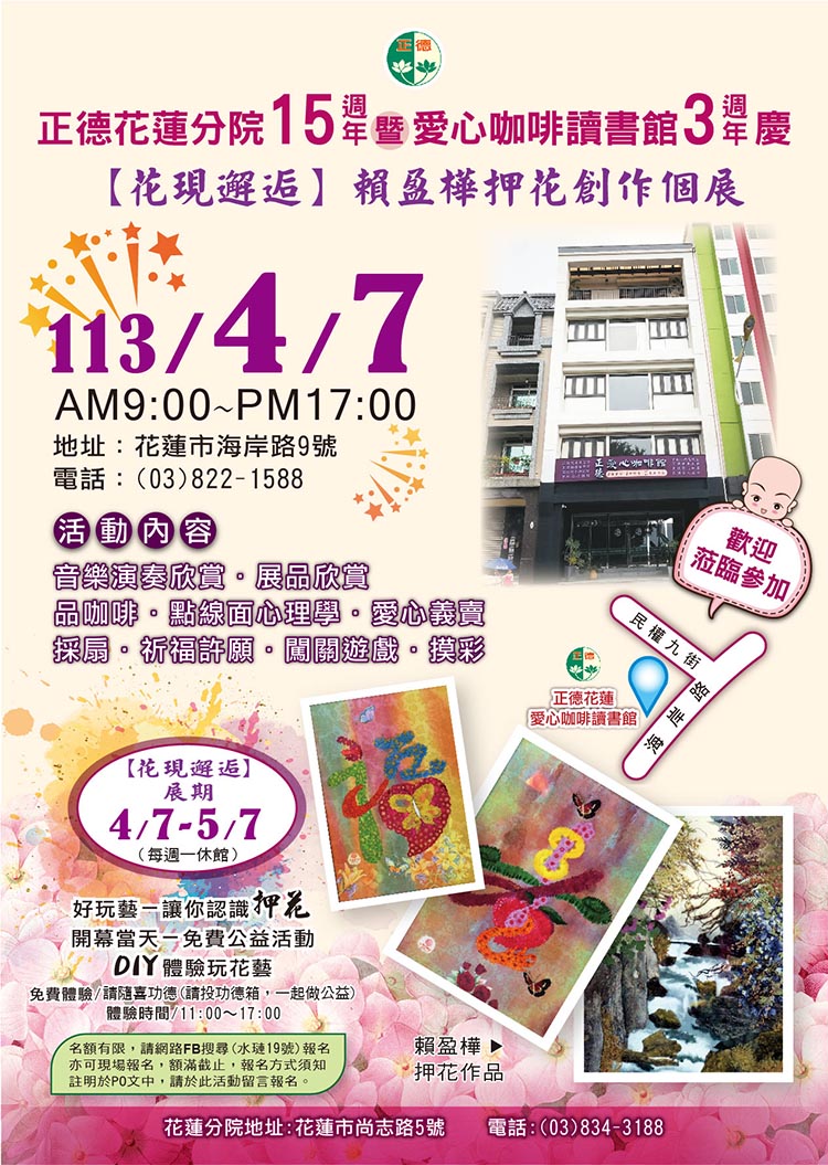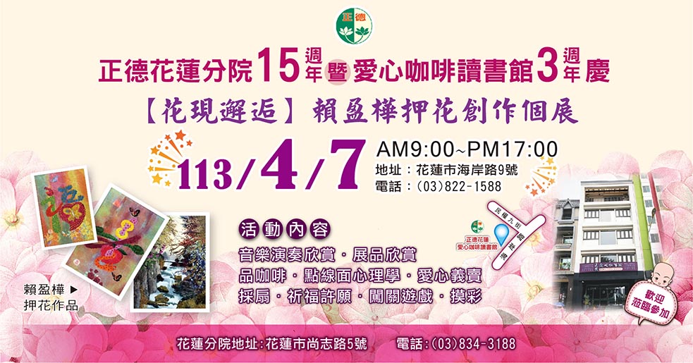 【正德愛心咖啡館】113年4/7(日) 正德花蓮分院15週年暨愛心咖啡讀書館3週年慶