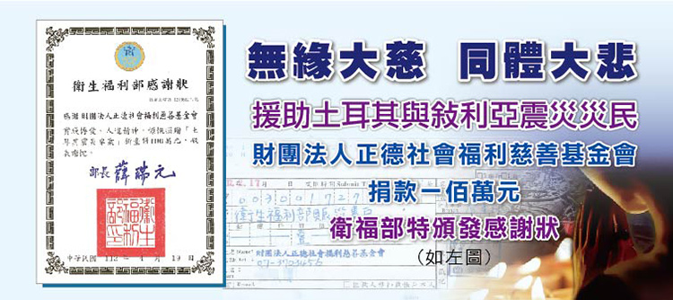 【正德社福】無緣大慈 同體大悲-援助土敘災民 衛福部特頒發感謝獎狀