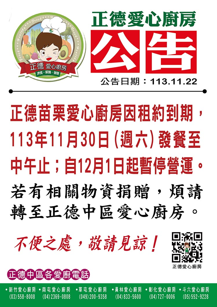 正德苗栗愛心廚房,因租約到期,113年12月01日起暫停營運,特此公告。