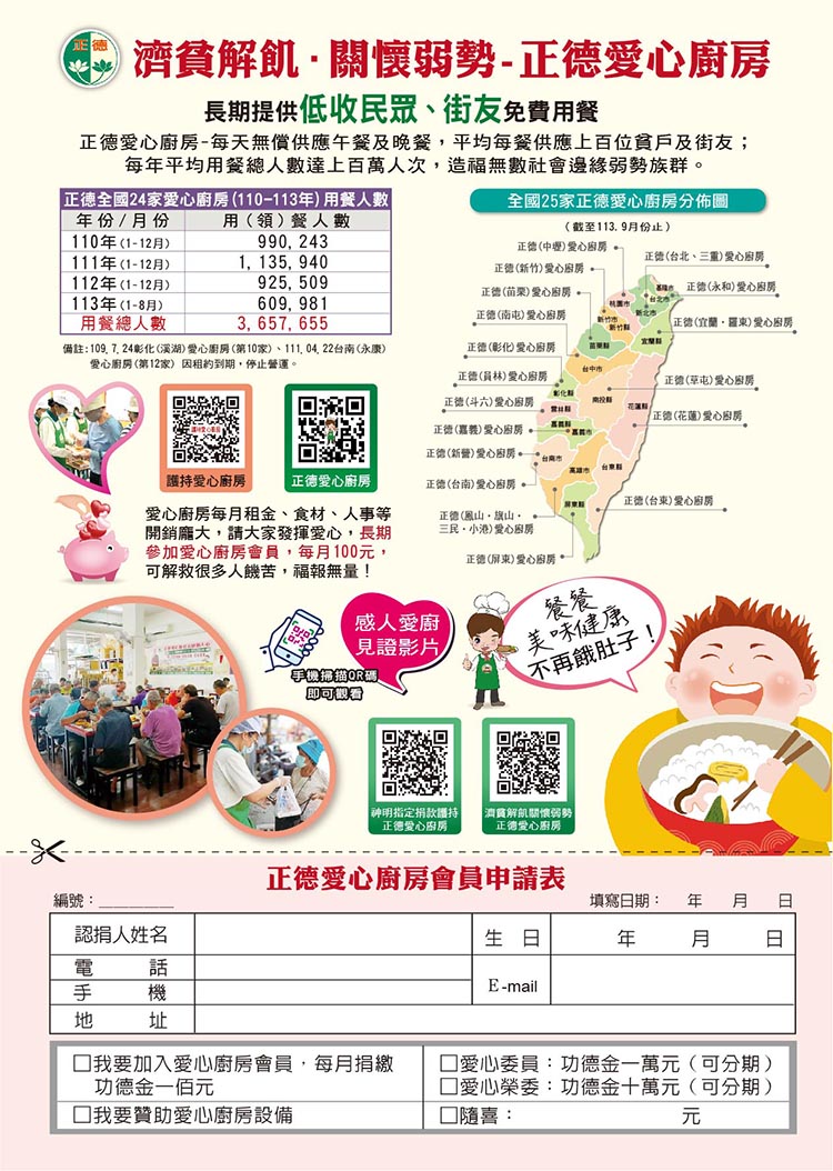 濟貧解飢,關懷弱勢!正德愛心廚房長期提供低收入民眾及街友免費用餐,每天無償供應午餐與晚餐,惠及上百位需要幫助的人。每年用餐總人數超過百萬,為無數社會邊緣弱勢族群帶來溫暖與希望。