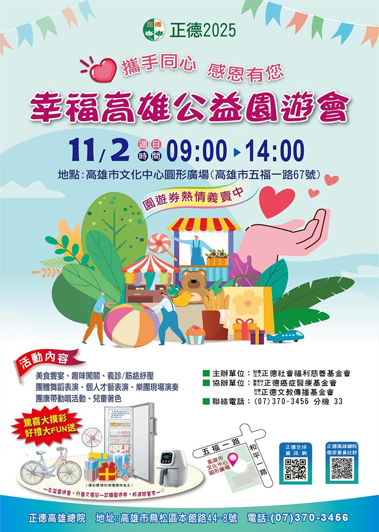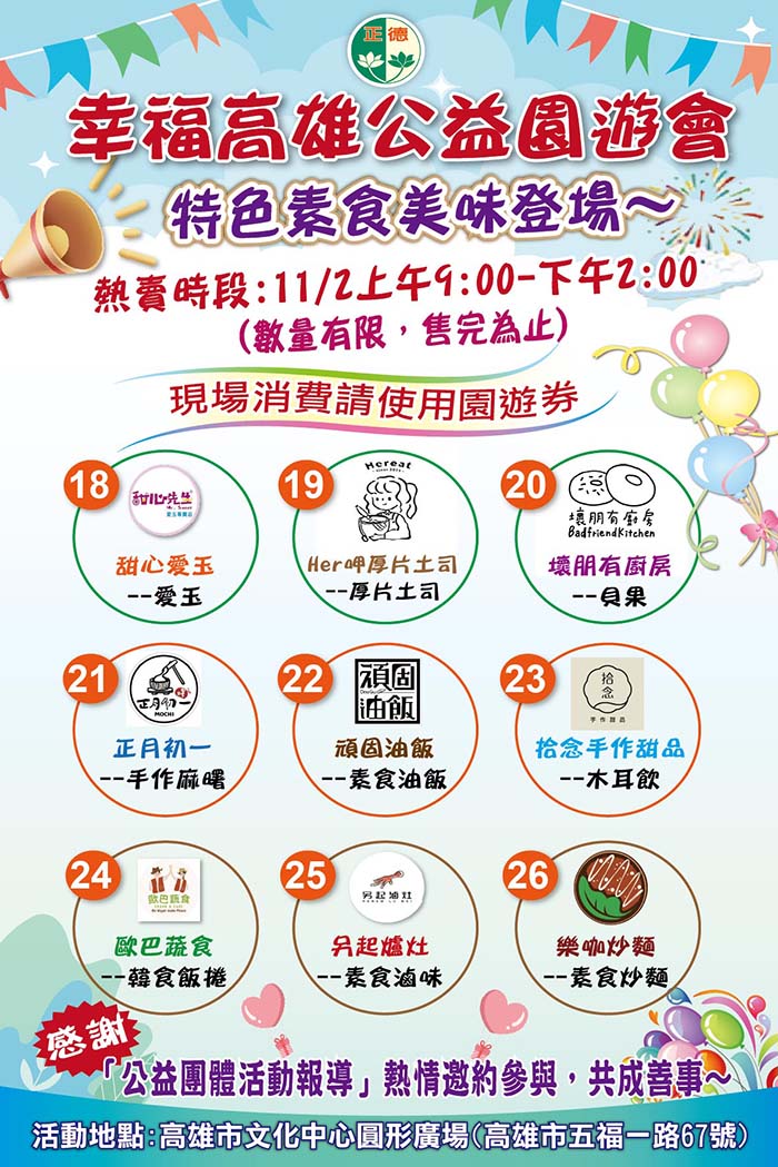🎪正德社會福利慈善基金會11/02於高雄市文化中心舉辦「幸福高雄公益園遊會」。