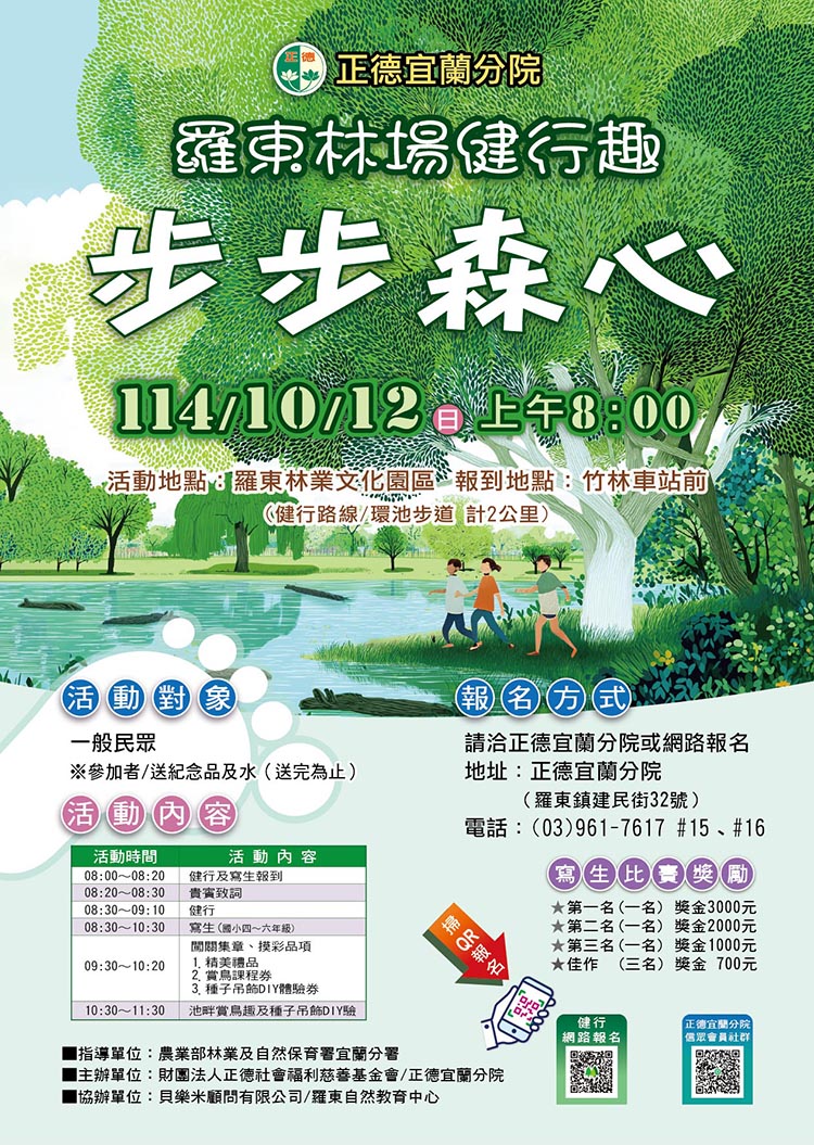 114/10/12 上午 8:00,邀您和家人一起參加「步步森心」健行活動,沿著環池步道漫步 2 公里,享受樹影婆娑、池畔飛鳥的美好風光。