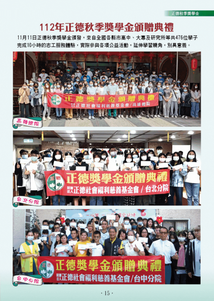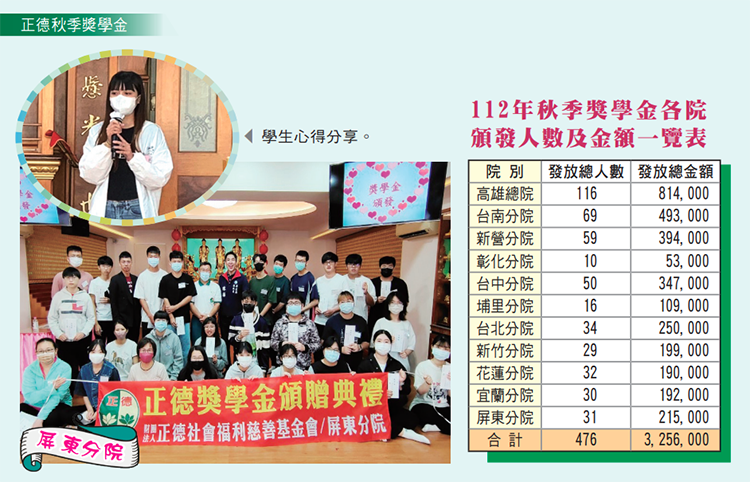 傳遞善與愛,努力向前發光!除頒發獎學金鼓勵弱勢學子,正德也讓獲獎學子體驗志工服務,啟發行善助人之樂,期待這群美善微小亮光,未來匯聚成火炬,溫暖照亮人間。~112年正德高雄總院秋季獎學金頒獎典禮~ |