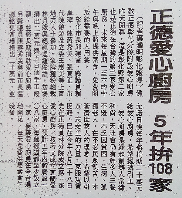 正德彰化分院附設正德愛心廚房,已於彰化分院一正式開幕開伙,未來每星期一至星期六中午與晚上提供素食,不收費開放各界用餐,期望人人都有基本的溫飽,讓社會更祥和進步。首日中午以自助餐提供來賓與民眾,共約一百餘人到場。