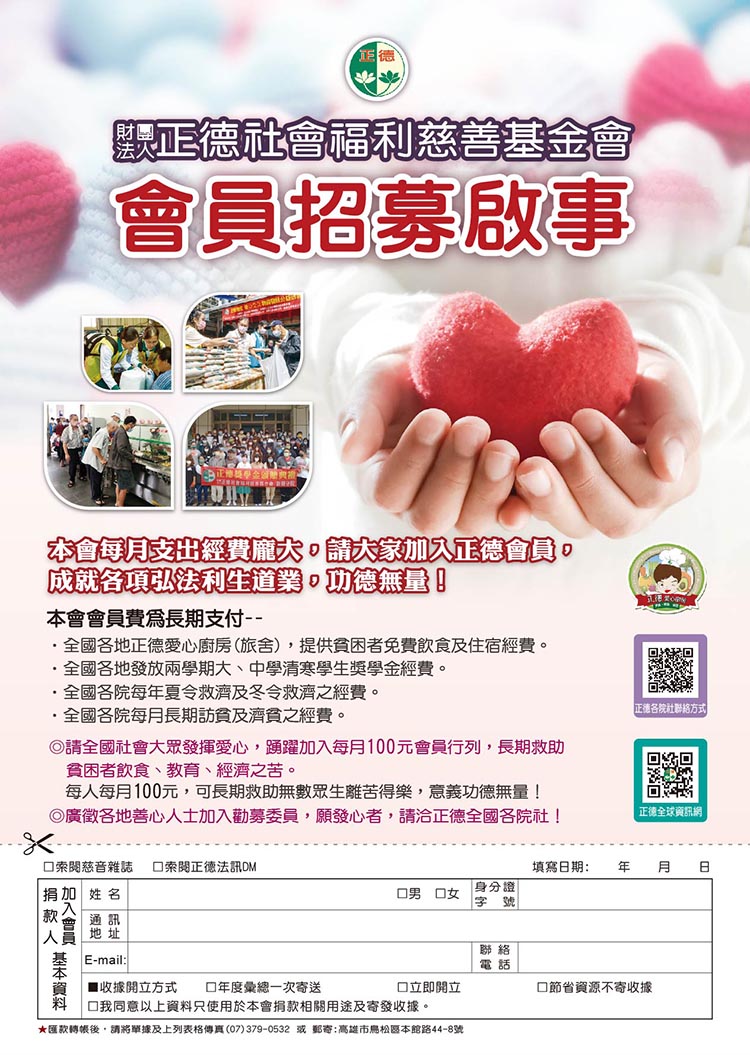 ◎請全國社會大眾發揮愛心,踴躍加入每月100 元會員行列,長期救助貧困者飲食、教育、經濟之苦。