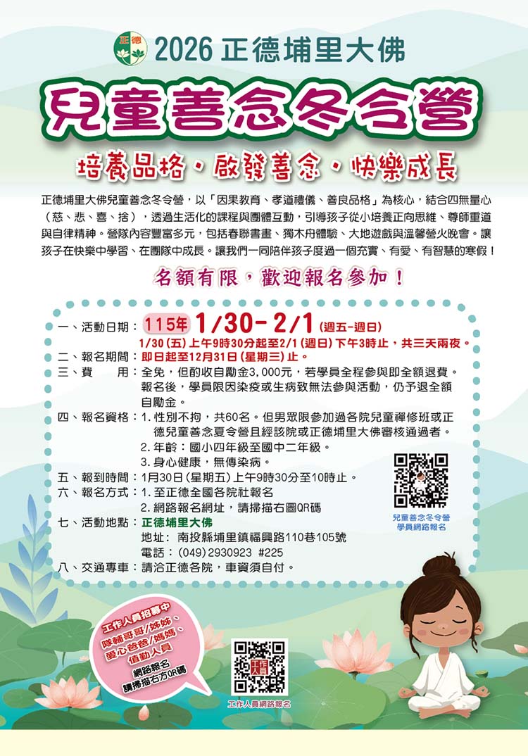 【兒童善念營】2026年培養品格.啟發善念.快樂成長🌸兒童善念冬令營-正德埔里大佛 開放報名中